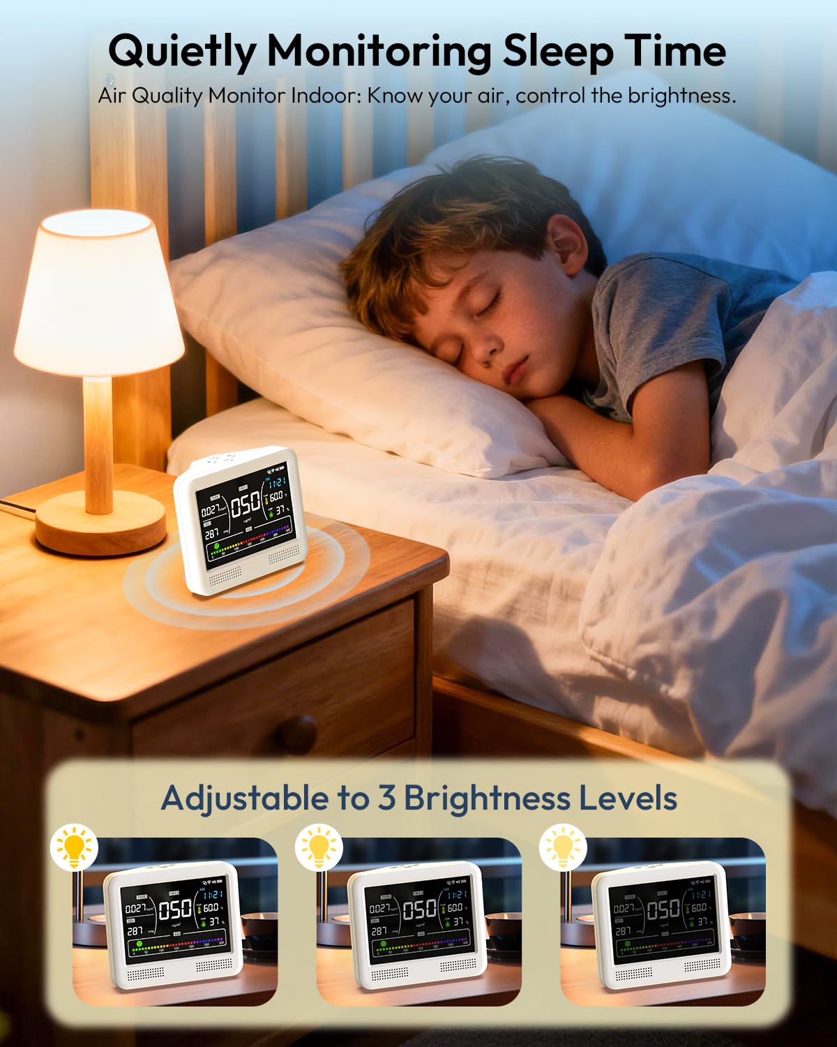 Convenient Control: This indoor air quality monitor puts you in complete command. Press the “Time Button” to toggle between 12/24-hour formats. Long-press the “Time Button” to enter setting mode. The clear, bright color display ensures excellent readability, with three-level brightness adjustment for comfortable viewing in any lighting.