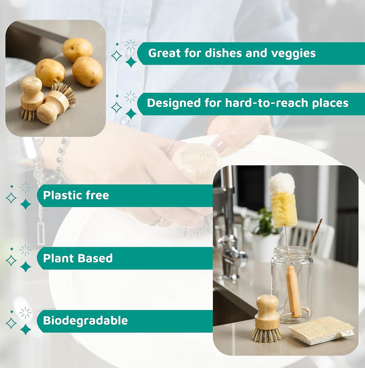 Complete cleaning kit: Tackle dishes, bottles, straws, and pots with bamboo dish brush, compact scrubber, bottle brush, straw brush, and fast-drying sponge.