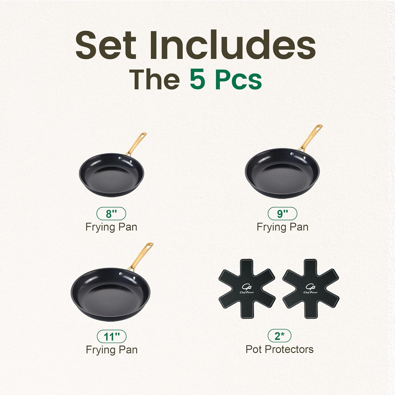 5Pcs frying pan Set Includes: 8″ Fry Pan, 9″ Fry Pan, 11″ Fry Pan, 2 Protectors.
