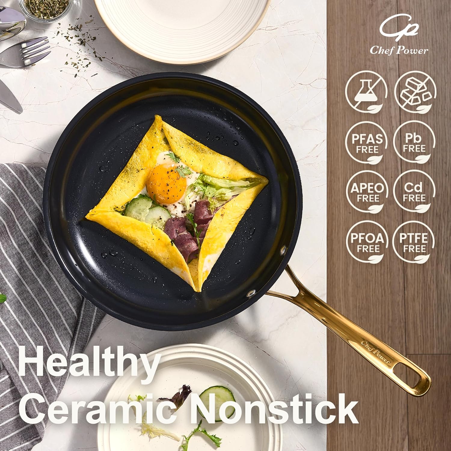 Healthy Ceramic Nonstick: Chef Power’s ceramic fry pan set features a natural stone-derived coating, free from Teflon, PFAS, PTFE, PFOA, lead, and cadmium—delivering safer, healthier cooking for your kitchen.