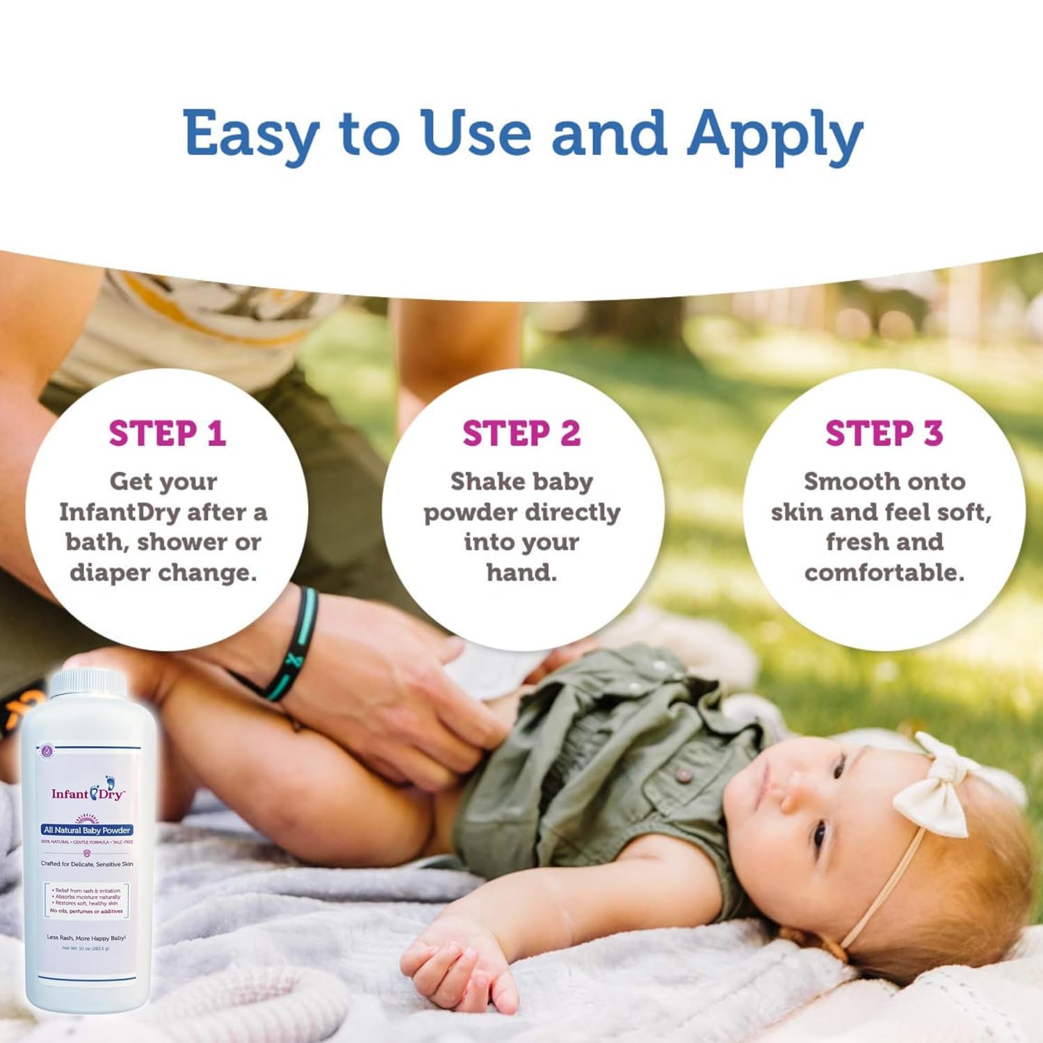Infant Dry Baby Powder is TALC-FREE, UNSCENTED and HYPOALLERGENIC. Its pure and gentle and specially designed for newborns and toddlers. It restores soft and healthy skin.