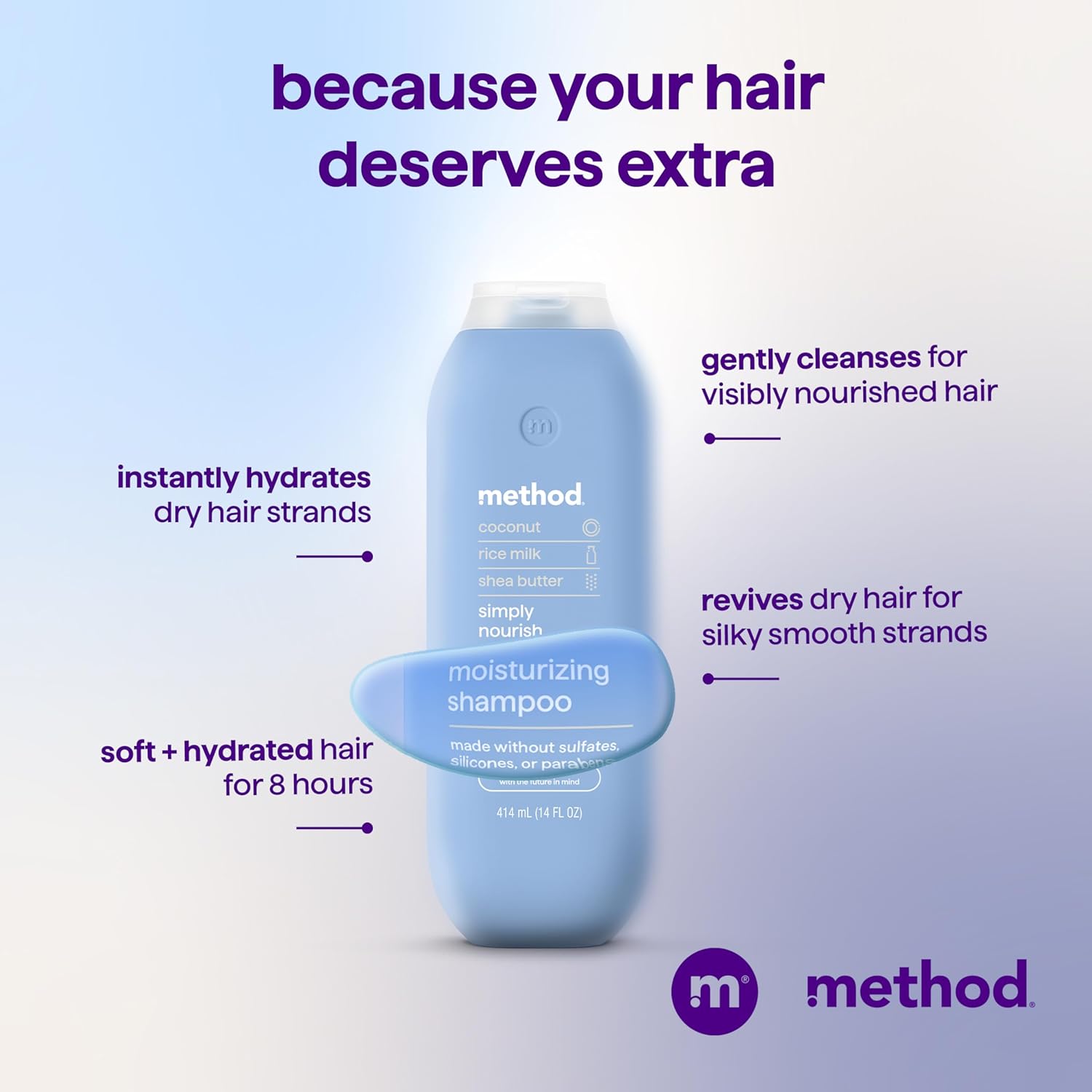 Is your hair calling out for love? Give it the deep moisture it craves with our Simply Nourish shampoo. This hair care essential is designed to gently cleanse and revitalize dry strands. Experience instant hydration from root to tip. Hair is left touchably soft, visibly nourished, and silky smooth for up to 8 hours. It’s the perfect way to transform your routine and get healthy-looking hair. Ready to turn your shower into a luxurious moment of me-time? Simply Nourish is a comforting, cozy trifecta of creamy coconut, rich rice milk, and warm shea butter. It’s a little escape, right in your shower. Smell great and feel even better. We believe in a smart, simple approach to beautiful hair. This sulfate-free shampoo is thoughtfully made without parabens, phthalates, silicones and dyes. Our formula focuses on what your hair needs to look its best. Using it is easy: just lather the rich shampoo into wet hair, massage your scalp, and rinse well. Feel great knowing you’re using a product that cleanses effectively and simply. Worried about your hair color? Don’t be. This shampoo is safe on color-treated hair, helping protect your look. The formula is wonderfully lightweight, so it won’t weigh your hair down or leave a greasy feeling. It also provides excellent detangling support, making your post-shower comb-through a breeze. Your hair is left manageable and looking fabulous. Our commitment to feeling good goes beyond just great hair. This nourishing shampoo formula features argan oil and jojoba oil to help achieve that soft, silky feel. We are proud that our Method hair products are cruelty-free, tested by people, not on animals. This bottle (minus cap) is made from 80% recycled plastic (PCR). When it’s empty, recycle it for good karma. Hair care you can feel great about.