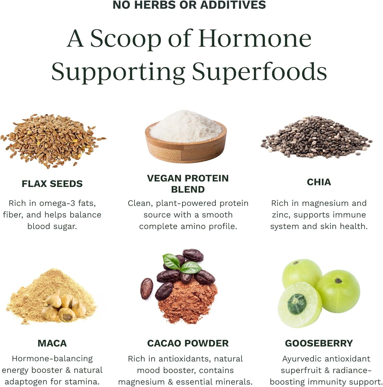 MENOPAUSE & PMS RELIEF SUPPLEMENT: Functional superfoods like flaxseed, chia, maca, and gooseberry help with hot flashes, irritability, and fatigue; protein powder women, protein powder vegan, cacao protein.