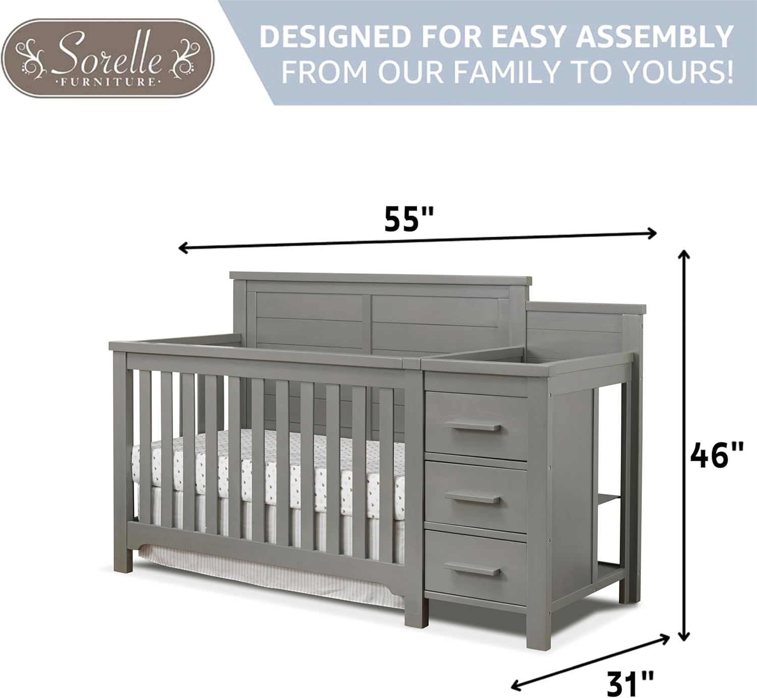 The Farmhouse crib and changer, another addition to Sorelle’s most popular category, is functional and attractive, featuring three large storage draws, two shelves on the side for storage, and a changer on top which comes with a topper pad. For more functionality, the changer section is detachable and converts to a nightstand when the crib is converted to a full-size bed. Designed with a farmhouse look and available in a stylish Weathered White or Weathered Gray finish, this crib can also be turned into a toddler-size bed or a full-size bed with the addition of the toddler rail or full-size rails