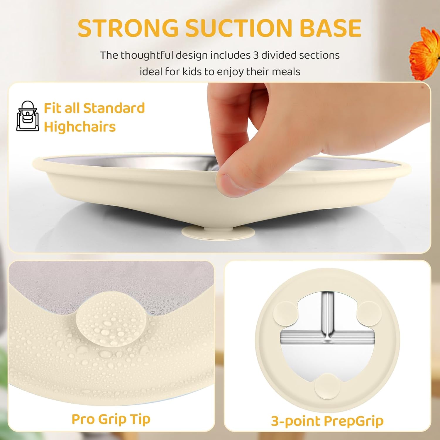 Unbeatable Suction Power,Mess-Free Mealtime with Secure Suction – Say goodbye to spills and flipped plates! Our set of stainless steel baby plates features a removable silicone suction base with strong suction cups, ensuring a stable grip on highchair trays and tables. Designed for self-feeding toddlers.